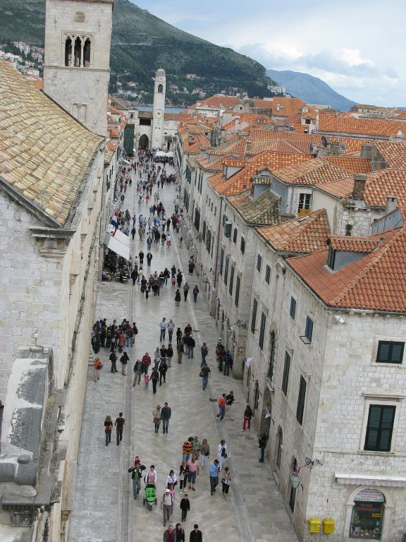 01-05 Het 200 m lange Stradun in de oude stad. 36 granaten sloegen hierin tijdens de Balkanoorlog. Daar is nu weinig meer van te zien. Unesco heeft met financiële hulp dit weer hersteld. |