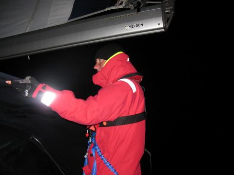 08-05 ‘Christa met volle bepakking. ‘s Nachts is het hartstikke koud. Ik had 2 t-shirts, 2 wind dichte jacks, een fleece jack, een gewone broek en een jogging broek aan, met daarover heen het zeilpak. Het is net een kampeerweekend in Mei. |