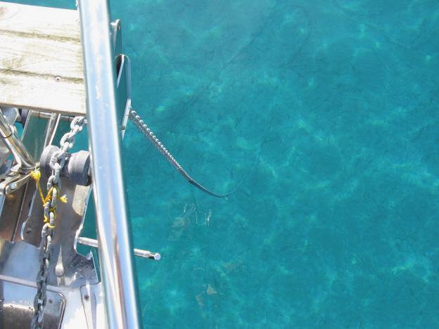 08-05 Voor anker in Erikoussos. 6 meter diep water en je ziet het anker met anker ketting liggen. |