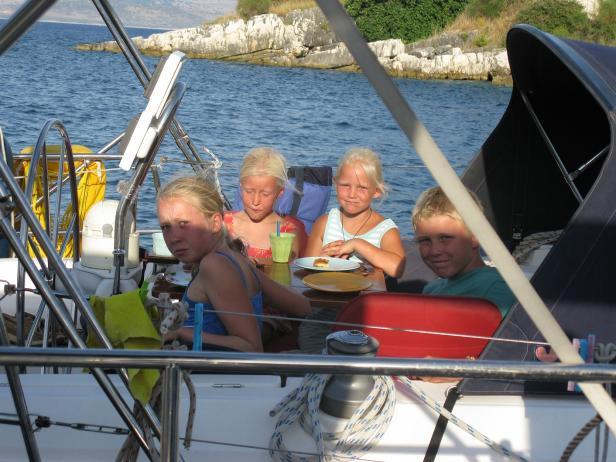 16-06 De afscheids BBQ in Kassiopi van Edward, Liane, Wouter en Lizelotte. Zij zijn op de terug reis na een jaar in de Middellandse zee gezeild te hebben. |